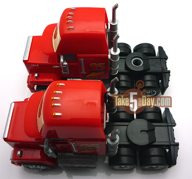 There are also some minor differences now but since we’ve only really had one release and just photos of the Chick Hicks Semi … it’s hard to say if those minor differences will continue or the two lines will converge to be exactly the same except for the eyes & mouth.