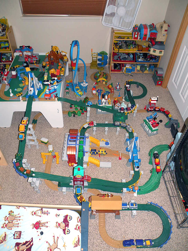What started as my mancave in 2007 has evolved into something like that 2 kids later. Just with Wooden Thomas tracks instead of Geo Trax. I stay busy putting the track back together numerous times a day. My one year old loves to do her Godzilla impersonation too.